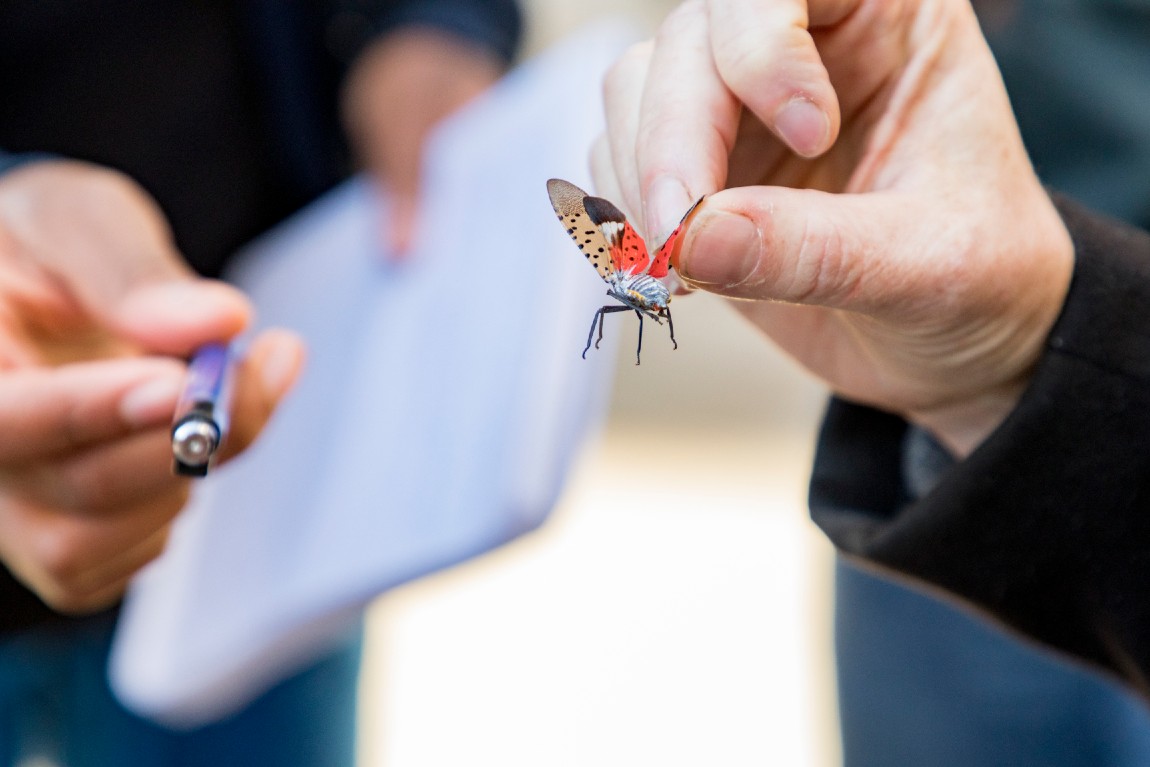 Biology Professor Marten Edwards (center), Chemistry Lecturer Gail Marsella (right) and local high school students examine a spotted lanternfly. Photos by Paul Pearson.Although they’re native to parts of Asia, millions of spotted lanternflies spent the summer and fall in southeastern Pennsylvania. They were busy sucking the sweet sap from the region’s bountiful grapevines and fruit orchards. They also swarmed the shiny glass surfaces of the Lehigh Valley’s highrises and descended in droves onto trees and gardens in parks and backyards across the region to lay their eggs.