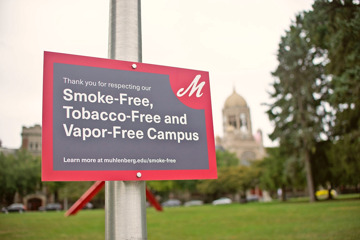 On August 15, 2019, Muhlenberg officially became a smoke-, tobacco- and vape-free campus, joining more than 2,000 colleges and universities nationwide who have made this commitment. The policy prohibits the use of all smoke and tobacco products, including cigarettes, e-cigarettes (including Juul) and smokeless tobacco, on College property.