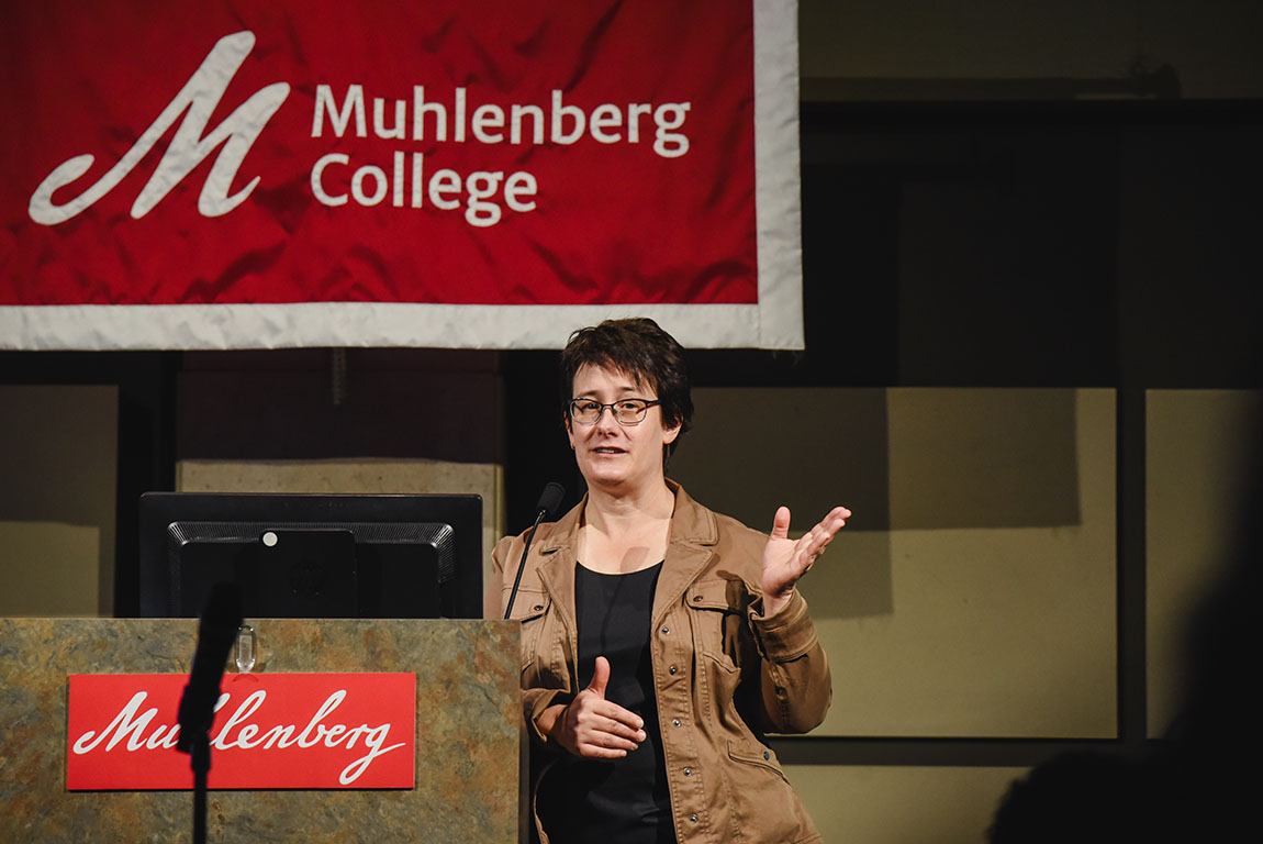Dr. Shelley Hershner. Photos by Kristi Morris, Littlewing PhotographyWhen Dr. Shelley Hershner asked the packed room of Muhlenberg students how many of them feel like they get an insufficient amount of sleep, nearly everyone raised their hands. The room erupted into laughter and chatter. As Hershner waited for the commotion to die down, students remarked to one another “I feel seen,” or, “Why do I feel like she’s talking to me?”